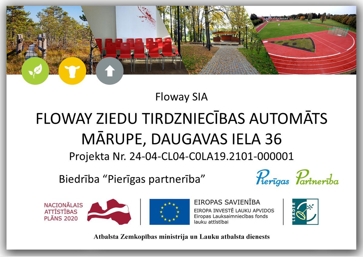 SIA Floway saņem Mārupes novada pašvaldības grantu 6000 eiro viedo ziedu tirdzniecības automātu attīstībai SEB bankas rīkotajā biznesa ideju grants konkursā “(ie)dvesma”.